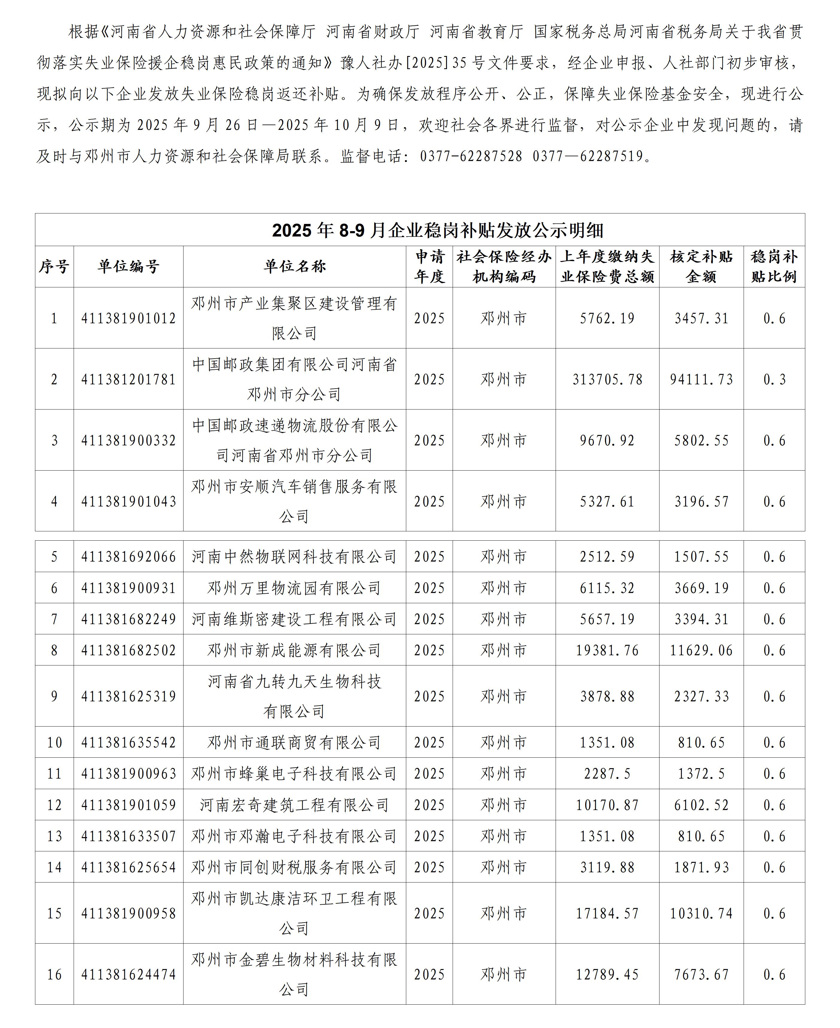 邓州市2025年8-9月企业稳岗补贴发放公示明细