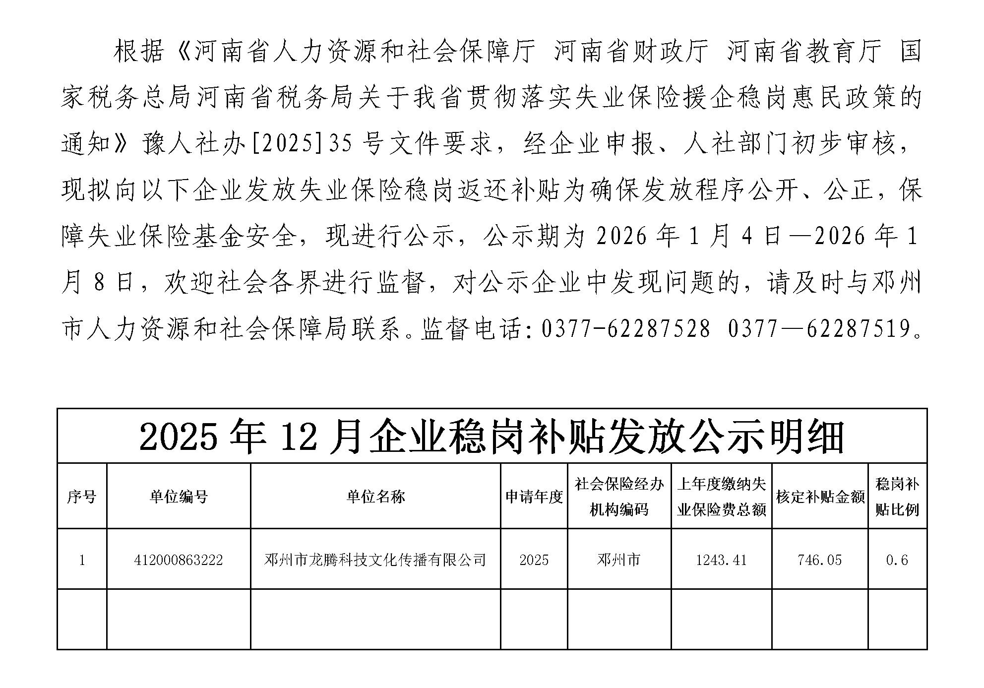2025年12月企业稳岗补贴发放公示